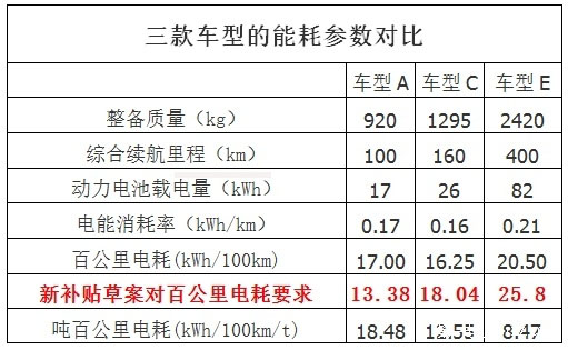照此表對(duì)比可見(jiàn),車型A為代表的微型電動(dòng)車仍然受限。而更大的車型C和車型E過(guò)關(guān)。與“噸百公里電耗”指標(biāo)要求效果類似。