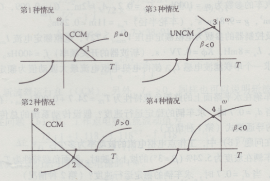 電動車系統(tǒng)的穩(wěn)態(tài)工作點分析,工作點即電機轉矩一角速度特性曲線與路面負載特性曲線的交點。這里選取了電機轉矩-角速度平面上3個象限中的4個工作點,分別代表了4種斬波器運行模式,它們是象限內(nèi)加速CCM(第1種情況),第四象限內(nèi)加速CCM(第2種情況)。