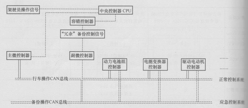 為了防備電動汽車的微控制器或電路因受干擾、老化或損傷而失效,引發(fā)電動汽車運行過程中發(fā)生事故,現(xiàn)代電動汽車上采用容錯控制器以實現(xiàn)容錯功能,容錯控制器一般采用冗余處理策略,即是在電子電器控制系統(tǒng)中,裝置一個主微控制器,并備份一個備用副微控制器,副微控制器具有主微控制器的基本功能,并對主微控制器有檢測的功能。一旦主微控制器發(fā)生故障,副微控制器立即“接管”主微控制器全部功能,保證電動汽車不至于陷入失控狀態(tài)而造成事故或損傷。容錯控制器發(fā)揮出“失效安全”(fail-safety)的作用。副微控制器可以重新啟動主微控制器,檢測其是否能夠恢復(fù)全部功能,還可以檢測出主微控制器是否損壞,以及實時取代主微控制器進入狀態(tài)。保證了電動汽車不會出現(xiàn)“死車”,而能夠維持返回或開到維修廠。采用“冗余”結(jié)構(gòu)的容錯控制器的容錯系統(tǒng)如圖5-39所示。
