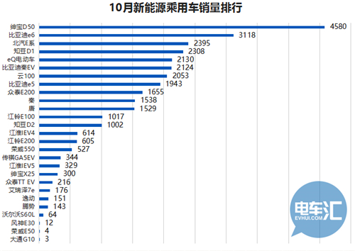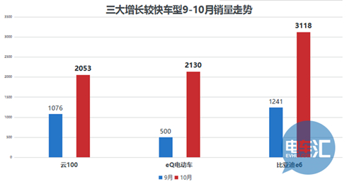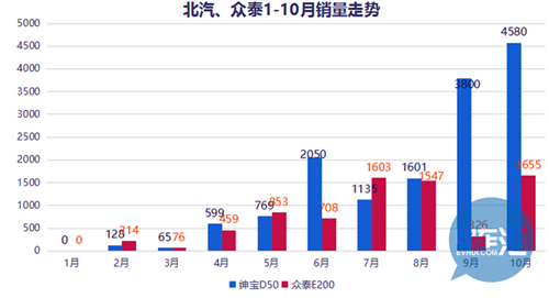 比亞迪e6、云100、eQ電動車三大車型銷量增速很大。眾泰E200本月銷量1655臺,上月僅僅326臺,而7月1603臺、8月1547臺,算是重新步入“正軌”。紳寶系列經(jīng)歷了9月超過的增幅,10月同樣有20.5%的增幅,達到了4580臺,有著不錯的增速和勢頭。