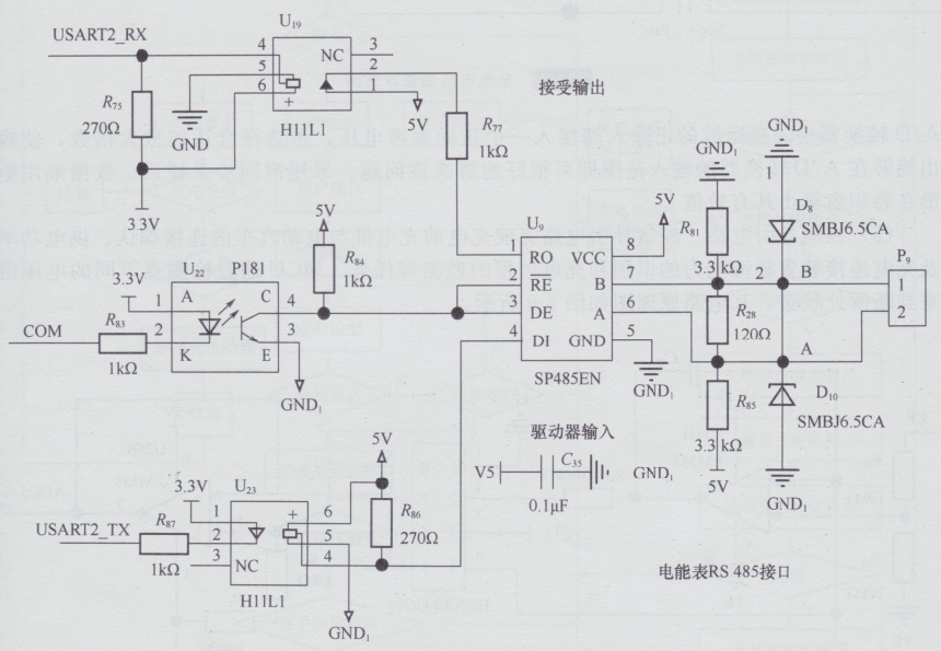 系統(tǒng)共使用四個(gè)串行接口,分別與LCD觸摸屏、熱敏打印機(jī)、讀卡器和RS?485接口的電能表通信。LCD觸摸屏和熱敏打印機(jī)為RS?232電平,經(jīng)過(guò)電平轉(zhuǎn)換與MCU通信。LCD觸摸屏與MCU的通信協(xié)議采用Modbus-RTU通信協(xié)議,MCU作為主機(jī),LCD觸摸屏作為從機(jī)。熱敏打印機(jī)根據(jù)打印機(jī)模塊提供的協(xié)議進(jìn)行通信。讀卡器為TTL電平,可以直接與MCU相連,采用讀卡器模塊提供的協(xié)議進(jìn)行通信。充電計(jì)量的電能表采用多功能單相表,選用2.0等級(jí)的電能表,電流規(guī)格為5(40)A?。電表提供RS-485接口,通過(guò)DL/T?645-2007通信協(xié)議與MCU通信。通過(guò)讀取電能表的電能值作為充電樁的電能計(jì)量值,通過(guò)讀取電表電流和電壓值來(lái)判斷充電過(guò)程中是否出現(xiàn)過(guò)流和過(guò)壓的情況,并加以處理。RS?485接口原理圖如圖所示。