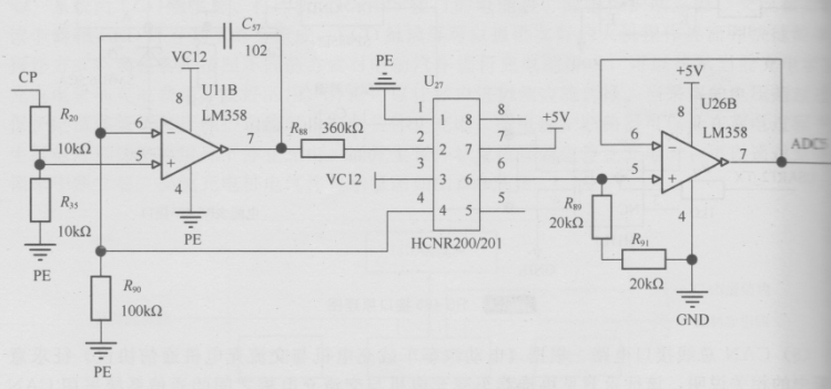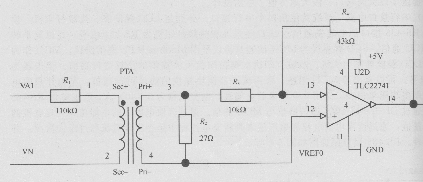 電壓測(cè)量首先需要通過(guò)測(cè)量互感器將電壓和電流轉(zhuǎn)換為可以測(cè)量的小信號(hào)。例如對(duì)220V的電壓信號(hào)的測(cè)量,采用的互感器變比為2mA/5mA,采用如圖所示的電路,可知在220V時(shí)互感器的輸出恰好為5mA。