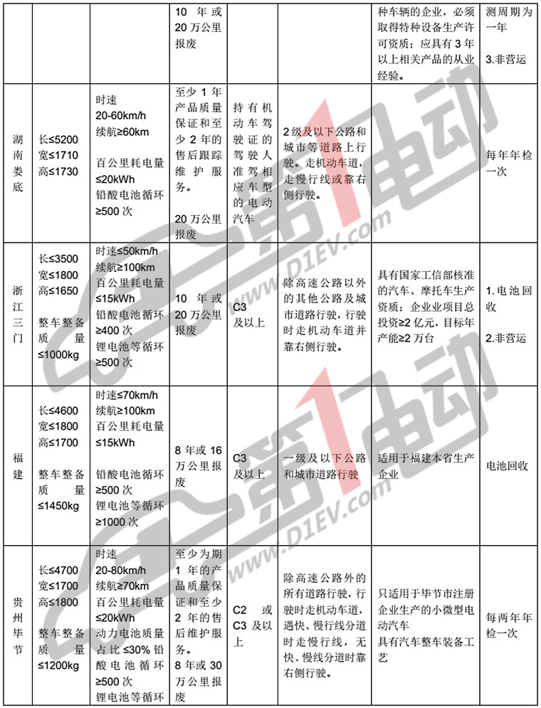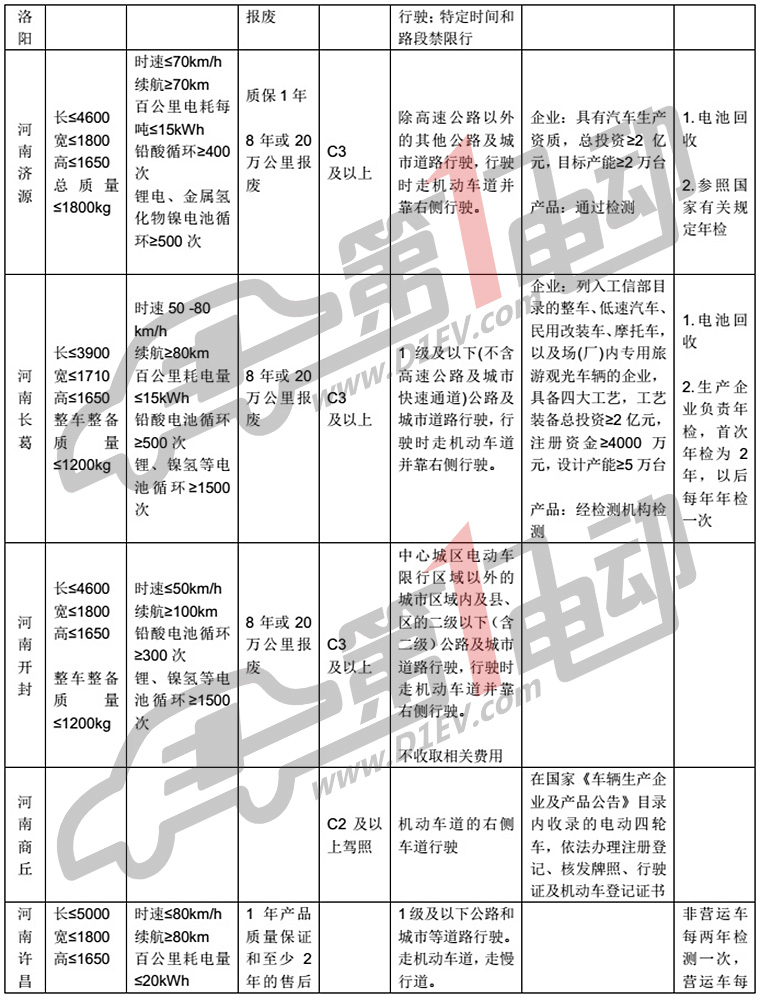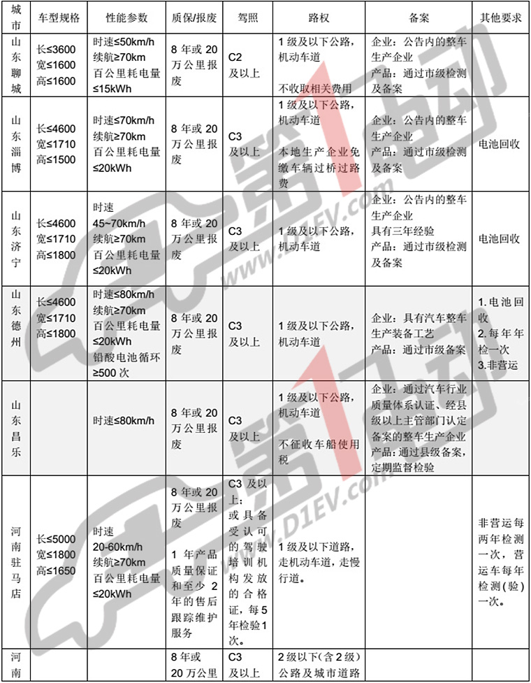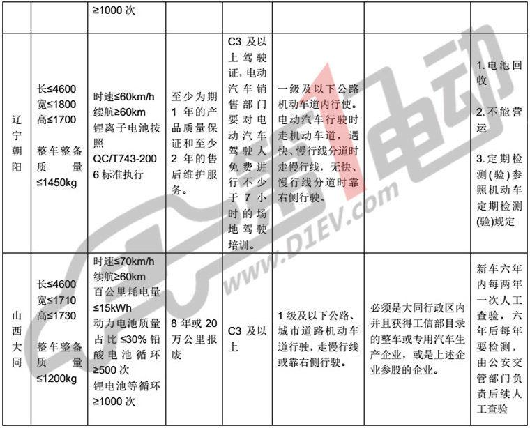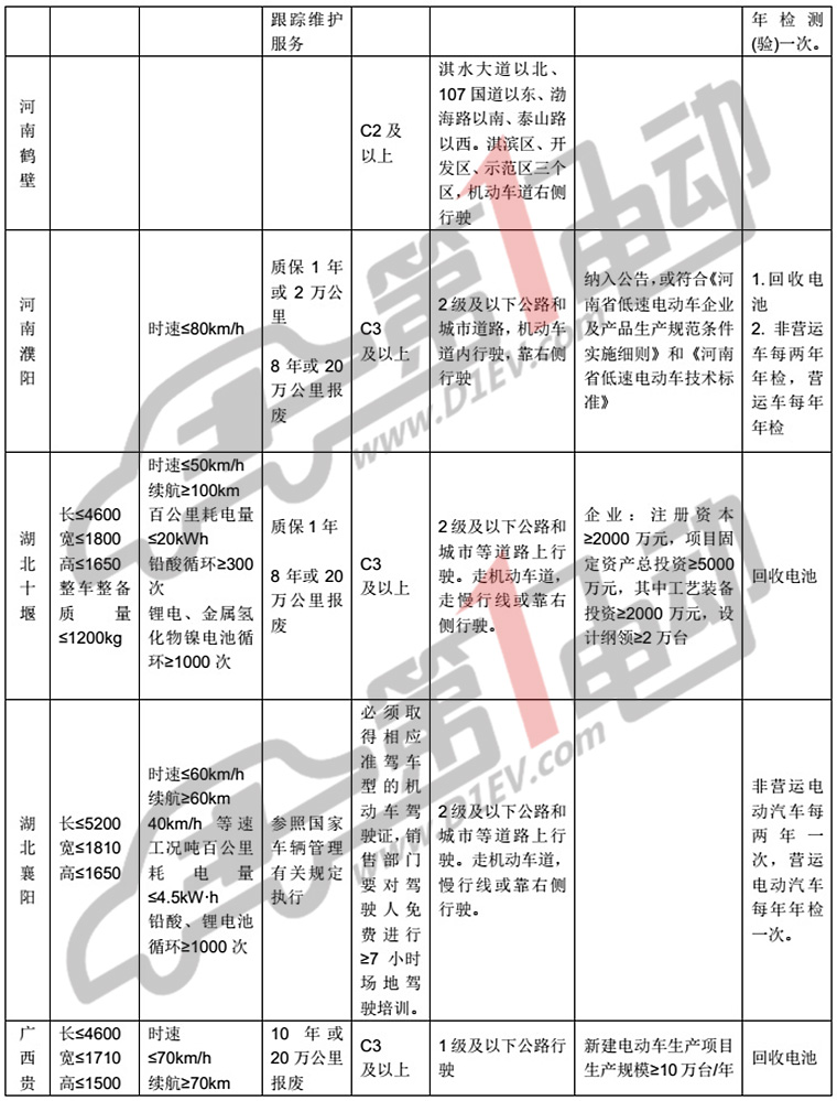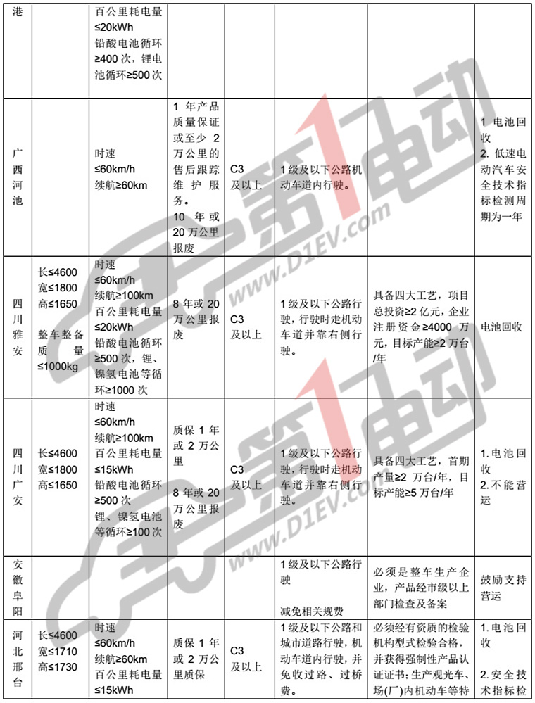 分析總結(jié)已出臺(tái)的地方管理政策,各地對(duì)低速電動(dòng)車(chē)的管理越來(lái)越嚴(yán)格,全面。對(duì)企業(yè)的備案管理中,越來(lái)越多的城市提出了制造工藝、投資規(guī)模、產(chǎn)能規(guī)模、資質(zhì)等方面要求。對(duì)于產(chǎn)品方面,各地對(duì)時(shí)速、續(xù)航、尺寸大小的要求不盡相同,縱觀目前市場(chǎng)上主流的低速電動(dòng)車(chē)產(chǎn)品,大多能滿足這些要求。有一定難度的在于百公里能耗及電池循環(huán)次數(shù)。高如湖北襄陽(yáng)要求鉛酸電池循環(huán)次數(shù)不低于1000,其他城市大多數(shù)要求循環(huán)次數(shù)不低于500次。年檢、質(zhì)保、報(bào)廢期的要求也能規(guī)范產(chǎn)品安全。在駕照方面,絕大多數(shù)城市要求的是C3牌照,山東聊城、河南商丘等少數(shù)城市要求C2牌照。路權(quán)方面,“一級(jí)及以下公路(城市)道路行駛”的規(guī)定居多,少數(shù)要求二級(jí)及以下。