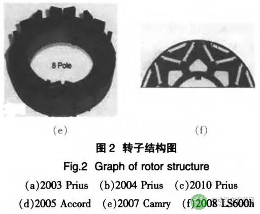 選用合適的轉子結構對永磁同步驅動電機性能有著極其重要的影響。日本豐田公司生產的混合動力汽車Prius(2003、2004、2010)、2007Ca唧和2008LS600h,本田公司生產2005Accord.其主驅動電機都采用了永磁同步驅動電機,但轉子結構不盡相同。其中,2005Accord為表面嵌入式結構,Prius、2007Camry和2008Ls600h為內置式結構,2003Prius的轉子結構為“一”字型,2004Prius、2010 Prius和2007Camry為“V”字型。2008Ls600h為“三角”型結構,如圖2所示,主要參數(shù)如表1