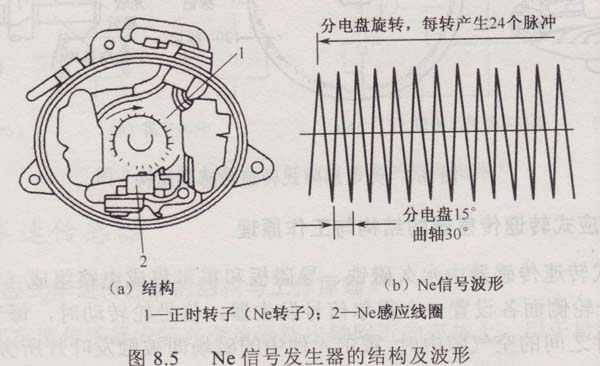 電磁感應(yīng)式轉(zhuǎn)速傳感器的工作原理如圖8.4所示。磁鐵的磁感應(yīng)線經(jīng)轉(zhuǎn)子、信號線圈、托架構(gòu)成回路。轉(zhuǎn)子由輸出軸帶動旋轉(zhuǎn),利用凸齒和托架之間的間隙變化,使通過信號線圈的磁通量發(fā)生變化,從而使線圈中產(chǎn)生感應(yīng)電壓來產(chǎn)生檢測信號。由圖8.4(b)可見,當(dāng)轉(zhuǎn)子的凸齒轉(zhuǎn)到A位置時(shí),信號線圈中通過大的磁通量,但其變化率為零,因而感應(yīng)電壓為零。當(dāng)轉(zhuǎn)至C位置時(shí),信號線圈中磁通量的變化率達(dá)到大,信號線圈中產(chǎn)生負(fù)方向的大感應(yīng)電壓。如此反復(fù),信號線圈上就產(chǎn)生交變電壓信號?,F(xiàn)以Ne轉(zhuǎn)子上有24個齒為例,Ne信號發(fā)生器的結(jié)構(gòu)及波形如圖8.5所示。在Ne信號線圈中產(chǎn)生出與凸起齒數(shù)相等的脈沖電壓信號。將這些脈沖電壓信號輸入電動機(jī)ECU,通過計(jì)算單位時(shí)間內(nèi)脈沖電壓的數(shù)目,即可確定電動機(jī)的轉(zhuǎn)速。