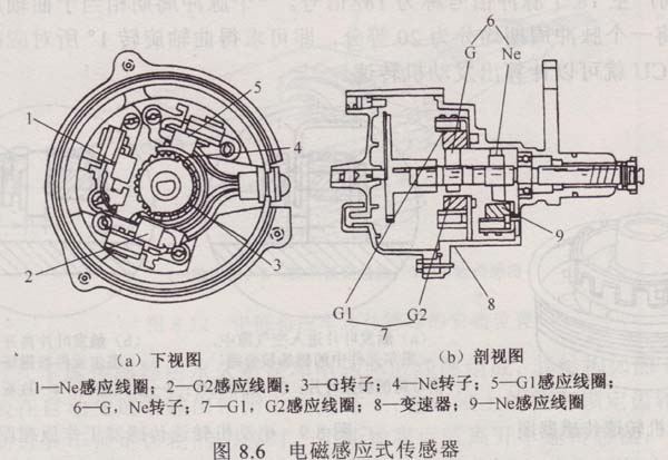 實(shí)際安裝在變速箱內(nèi)的電磁感應(yīng)式傳感器結(jié)構(gòu)如圖8.6所示,主要由磁鐵、信號線圈和轉(zhuǎn)子等組成。G轉(zhuǎn)子和Ne轉(zhuǎn)子固定在變速器輸出軸上,與輸出軸同步轉(zhuǎn)動,信號線圈固定在變速器殼體上。