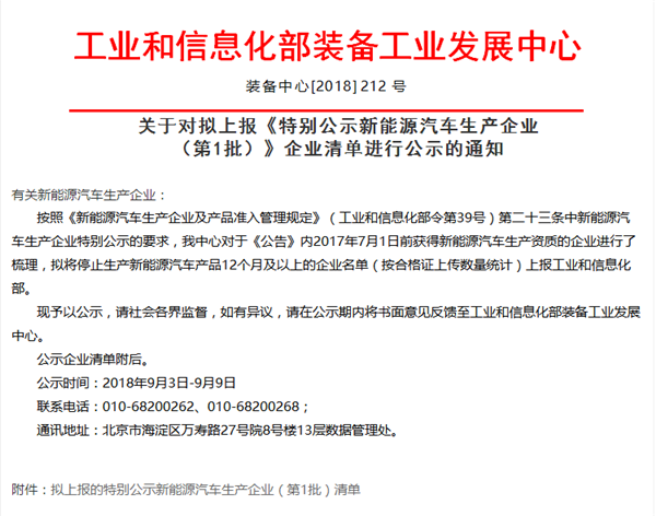 9月3日,工業(yè)和信息化部裝備工業(yè)發(fā)展中心發(fā)布了一則“關(guān)于對擬上報《特別公示新能源汽車生產(chǎn)企業(yè)(第1批)》企業(yè)清單進(jìn)行公示的通知”(以下簡稱《通知》),對于《公告》內(nèi)2017年7月1日前獲得新能源汽車生產(chǎn)資質(zhì)的企業(yè)進(jìn)行了梳理,對停止生產(chǎn)新能源汽車產(chǎn)品12個月及以上的30家企業(yè)在9月3日-9月9日期間進(jìn)行公示,如企業(yè)在公示期內(nèi)未將書面意見反饋,將上報至工業(yè)和信息化部。