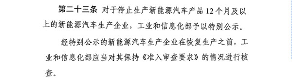 事實(shí)上,本次《通知》發(fā)布的依據(jù)是工信部2017年1月17日發(fā)布的《新能源汽車生產(chǎn)企業(yè)及產(chǎn)品準(zhǔn)入管理規(guī)定》。其中,第二十三條明確指出:“對于停止生產(chǎn)新能源汽車產(chǎn)品12個月及以上的新能源汽車生產(chǎn)企業(yè),工業(yè)和信息化部予以特別公示。經(jīng)特別公示的新能源汽車生產(chǎn)企業(yè)在恢復(fù)生產(chǎn)之前,工業(yè)和信息化部應(yīng)當(dāng)對其保持《準(zhǔn)入審查要求》的情況進(jìn)行核查。”