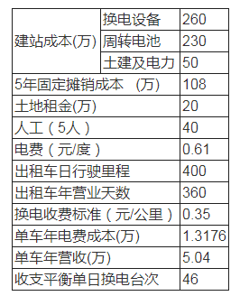 公開(kāi)資料顯示北汽電池收費(fèi)套餐折合為0.35元/公里,換電站的運(yùn)營(yíng)成本包括建站成本、用電、地租和人工等,我們從投資收益的角度對(duì)出租車(chē)底盤(pán)換電模式進(jìn)行初步的探討跟分析: